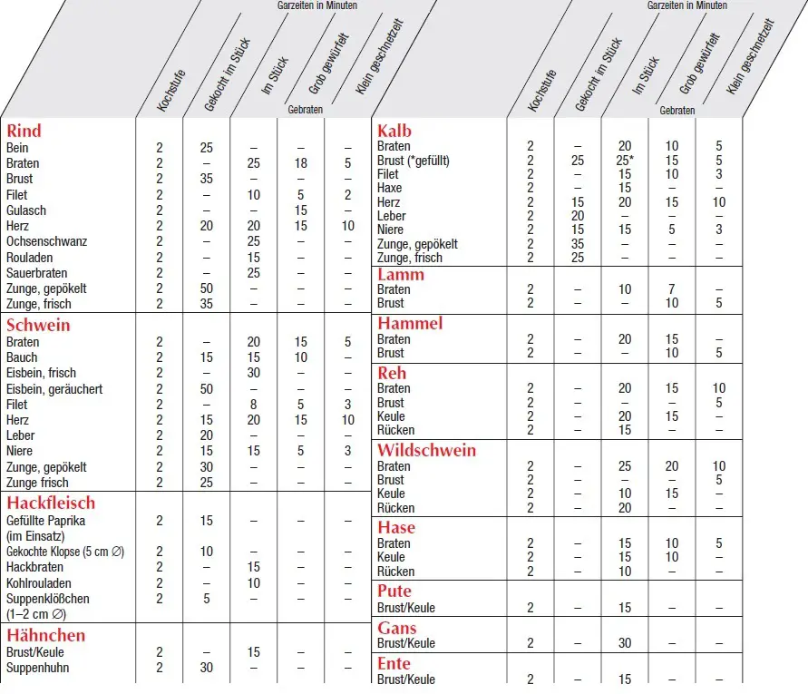 Aufgrund des Umfangs, werde ich die Garzeiten für Fleisch nur als Bild zur Verfügung stellen: